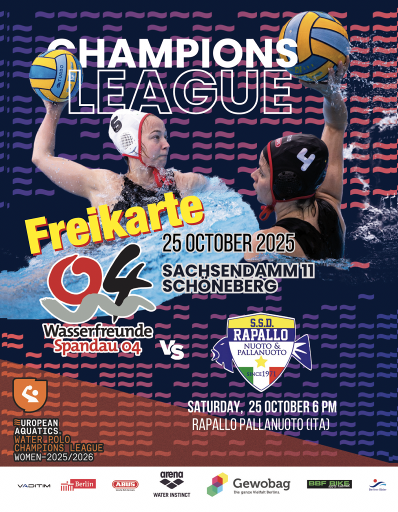 Am Samstag spielen unsere Frauen in der Schöneberger Schwimmhalle gegen den italienischen Meister Rapallo. Der Eintritt ist kostenlos und unser Team freut sich auf zahlreiche Fans.
