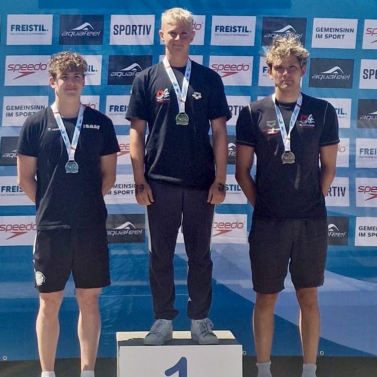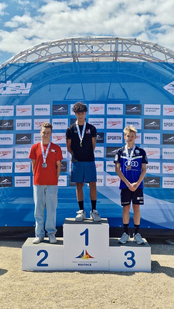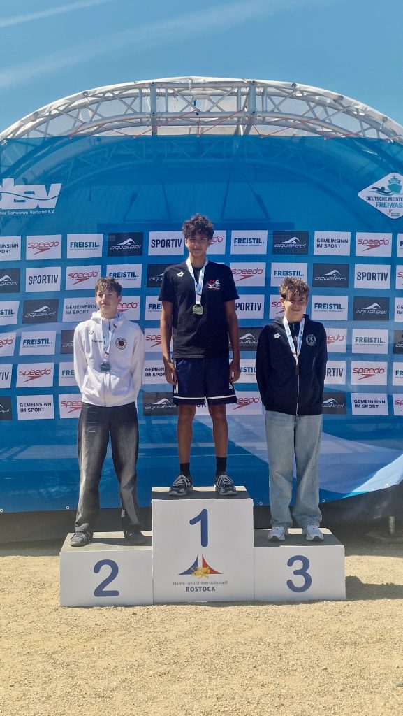 Insgesamt fünf (!) deutsche Meistertitel fischte unser Freiwasserteam in den Einzelstrecken aus dem Rostocker Hafenbecken. Besonders überzeugend präsentierten sich die Ammar-Brüder Akram (2011) und Yessin (2010), die in ihren Jahrgängen über 2,5 und 5 km jeweils souverän Doppelgold abräumten. Damit untermauern die Brüder eindrucksvoll ihre Qualitäten im Freiwasser – womit auch im Hinblick auf eine mögliche Nominierung für den kommenden Nationalkader künftig kaum ein Weg an ihnen vorbeiführen dürfte.