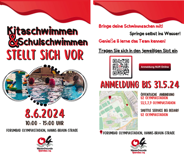 Am 8. Juni 2024 haben Sie die Möglichkeit, unser Kita- und Schulschwimmen kennenzulernen. Das gesamte Team ist in der Schwimmhalle anwesend.